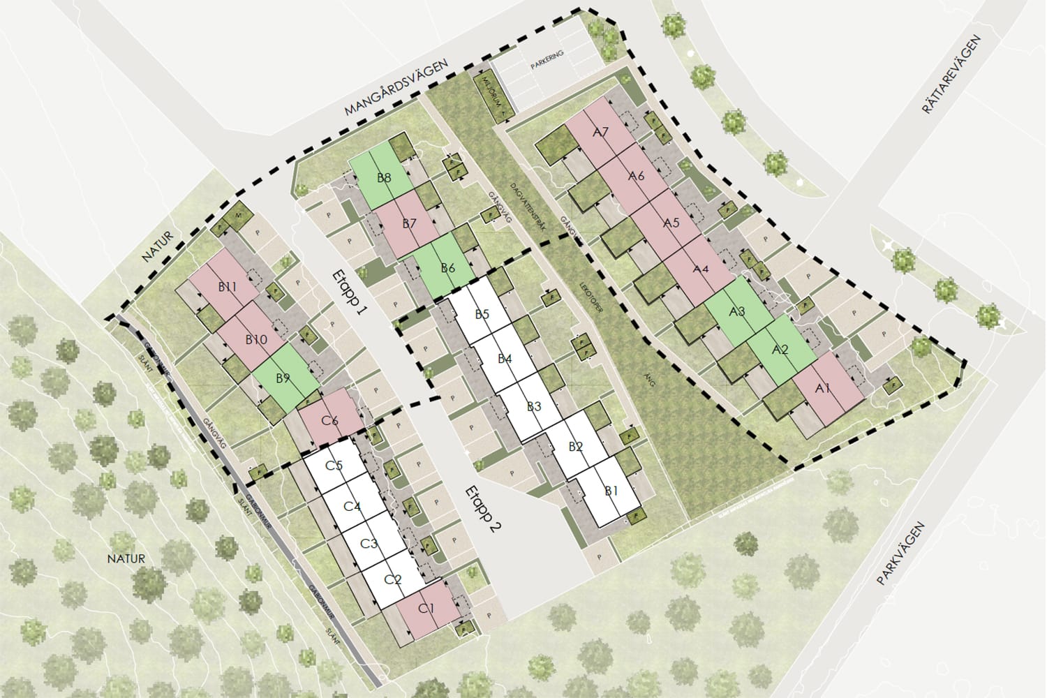 Här har vi skapat ett bostadsområde där trä, natur och trygghet går hand i hand. Fasaderna går i dova, jordnära kulörer och ramarna runt husen fylls av planteringar, stigar och sociala ytor. Varje bostad – oavsett om du väljer ett radhus i två plan eller ett bekvämt enplanshus – är byggd med omtanke, kvalitet och långsiktighet.